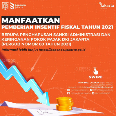 Insentif Fiskal Tahun 2021 merupakan pemberian insentif atau keringanan bagi Wajib Pajak Daerah di DKI Jakarta berupa penghapusan sanksi administrasi dan pengurangan pokok terutang pajak.